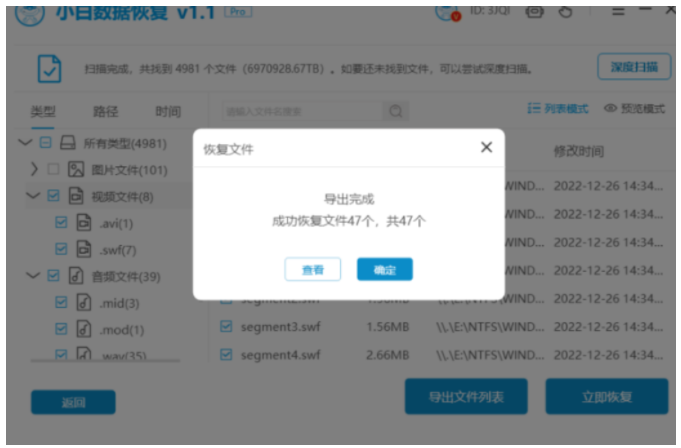 3、耐心等待數據掃描完成后,選擇需要恢復的文件類型,點擊立即恢復,等待軟件對這些數據進行恢復。