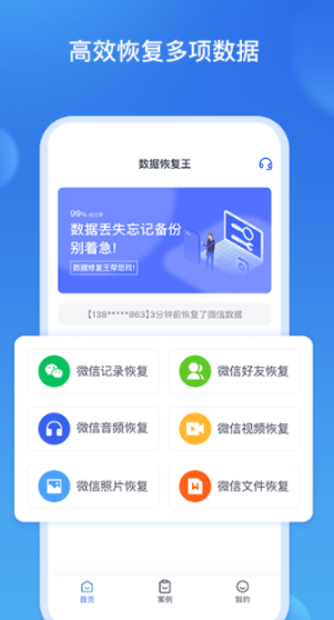 數據恢復王是一款專業的手機數據恢復軟件,它通過強大的系統底層掃描檢測技術,快速的找回并恢復您丟失的手機數據,支持誤刪及未保存微信語音、圖片、視頻、文件恢復。