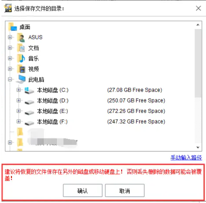 4、最后將會彈出恢復文件保存的目錄窗口的頁面,需要注意的是不要保存在文件原來的位置,因為這樣會對原來位置的數據導致二次覆蓋,;選擇保存位置,點擊【確定】,文件即可成功恢復到所需磁盤位置。