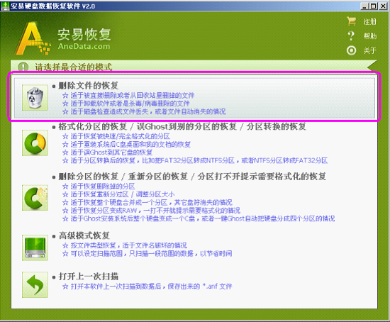 1、首先打開軟件后,選擇數據掃描的模式。根據常見的文件丟失情況,軟件提供了共5個功能模塊,大家按需選擇。