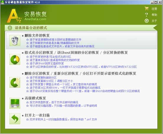 安易數據恢復軟件是一款文件恢復功能非常全面的軟件,支持微軟操作系統用到的NTFS分區、FAT和FAT32分區、exFAT分區的數據恢復,能夠恢復經過回收站刪除掉的文件、被Shift+Delete鍵直接刪除的文件和目錄、快速格式化過的分區、完全格式化的分區、分區表損壞和盤符無法正常打開的分區數據、在磁盤管理中刪除的分區、被重新分區過的硬盤數據、被第三方軟件做分區轉換時丟失的文件等。