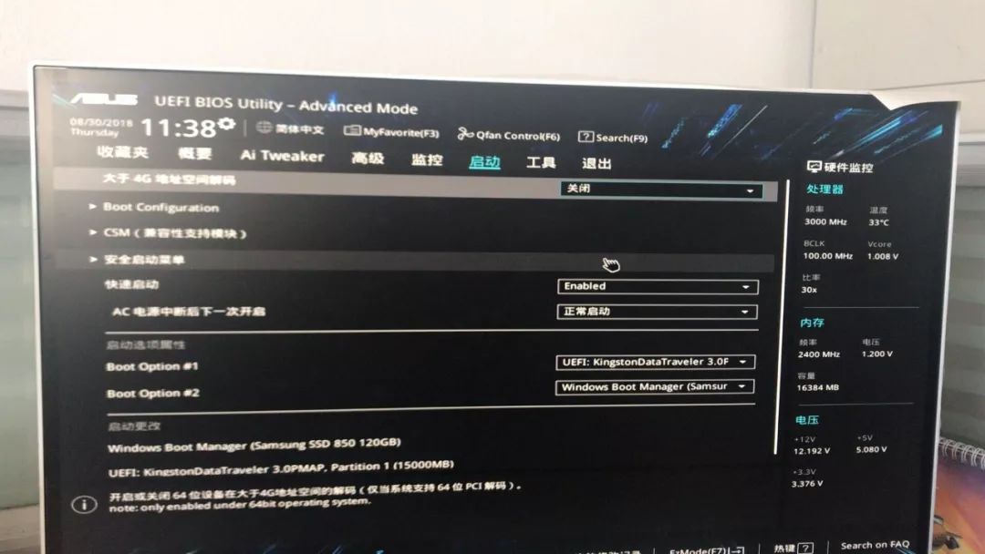 2、打開后發現只有UEFI開頭的U盤名稱,但不是我想的傳統模式,接下來我要修改安全引導;打開兼容模式;設置啟動順序