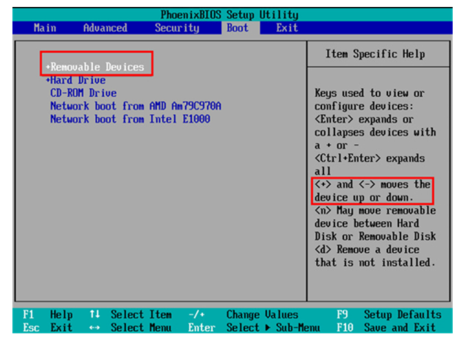 3、查看說明,按+鍵實現向上移動,我們需要將“removable device”移到最上面,這樣才能實現從U盤啟動,如圖所示: