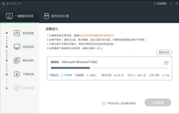 步驟三:現在這一步時你們即可離開電腦,程序會全自動完成重裝步驟。為避免出現安裝失敗,用戶也可以選擇“制作啟動U盤”進行U盤裝機。