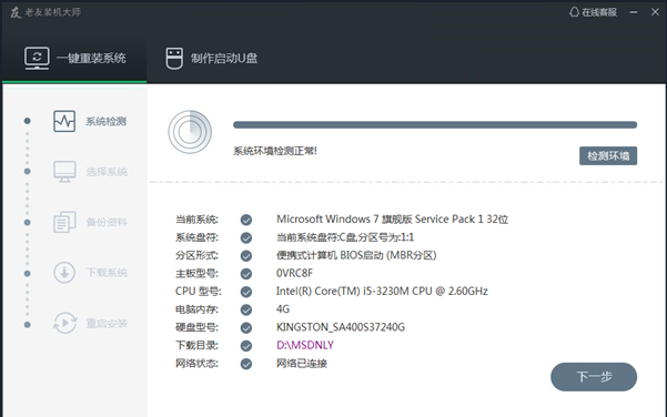 步驟一:我們首先下載軟件,軟件下載完成后正常打開(“一鍵重裝系統”),程序會默認檢測當前的系統環境,檢測完成后,點擊“下一步”即可。