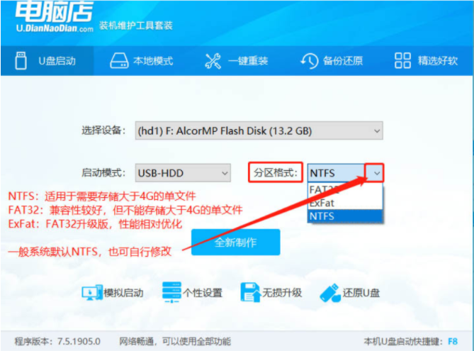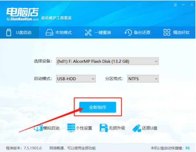 4. 一般建議保持默認,即USB—HDD模式以及NTFS格式,最后選擇“全新制作”。