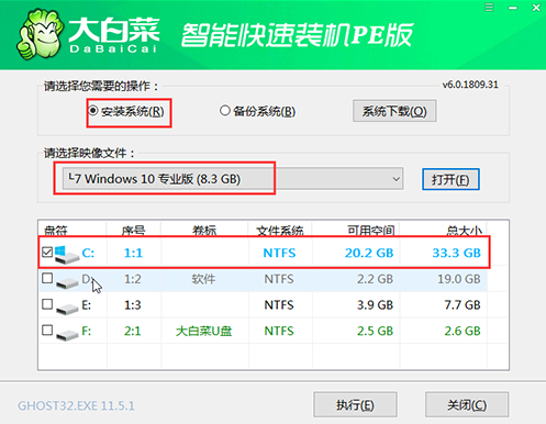 3、進入pe系統后,鼠標左鍵雙擊打開大白菜一鍵裝機軟件,點擊“安裝系統”,選擇win10映像文件,安裝在“C盤”,點擊執行。
