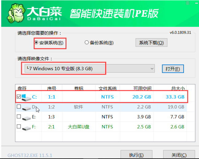 步驟三:接著打開大白菜軟件,在“映像路徑”中選中鏡像文件并選擇win10系統安裝位置,單擊“執行”即可。
