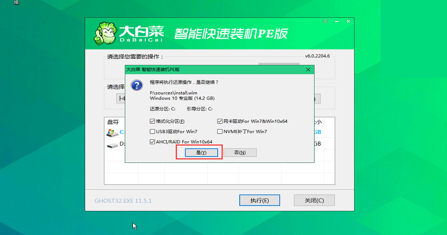 4、因為我們要安裝的是win10,所以這里選擇選擇“windows10專業版”點擊“確定”。這一步是通過U盤里面準備的ISO鏡像文件安裝,參考下圖,再點擊“執行”在大白菜一鍵還原窗口。