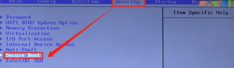 2.進入BIOS界面后用方向鍵移到Security進入界面,選中SecureBoot項回車進入界面。
