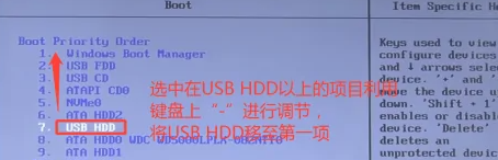 5.選中在USB HDD項以上的項,利用鍵盤上“-”進行調整順序,直到將USB HDD項調至第一行為止。