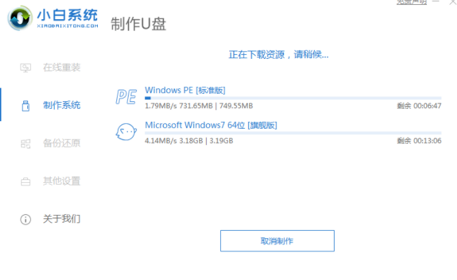 1、打開可用電腦上的小白重裝系統工具,把自己的8GB以上的空白U盤接入電腦的接口,進入工具的主頁面中,點擊左側的制作系統功能,點擊開始制作。