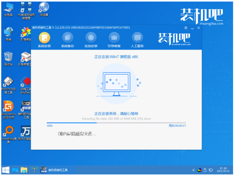 5、在pe系統鼠標點擊打開裝機吧裝機工具,選擇需要安裝的win7系統,點擊安裝到系統盤c盤。