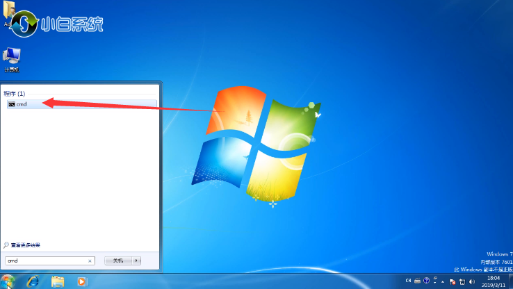 1.我們點擊開始菜單欄,輸入“cmd”命令。
