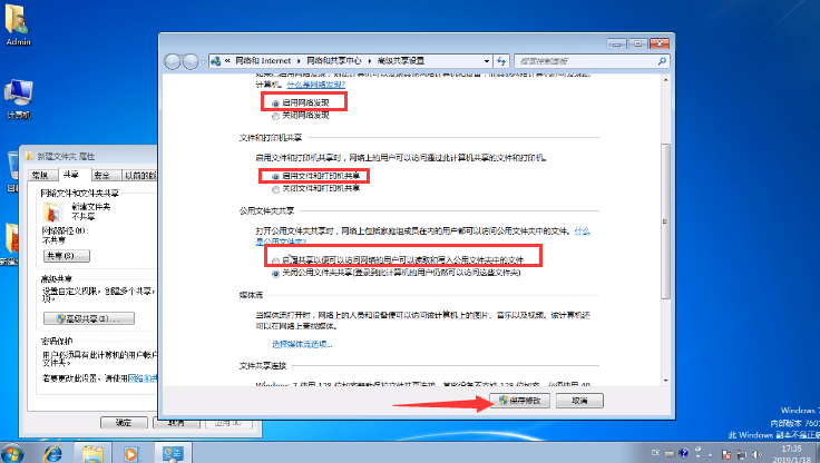 3.在頁面中,打開”啟用網絡發現“和”啟用文件和打印機共享“,點擊”啟用共享以便可以訪問網絡的用戶可以讀取和寫入公用文件夾中的文件“,設置完成后點擊”保存修改“。
