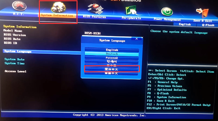 2.進入頁面后,按方向鍵向右選擇第二個選項,將我們的語言種類改為“簡體中文”。