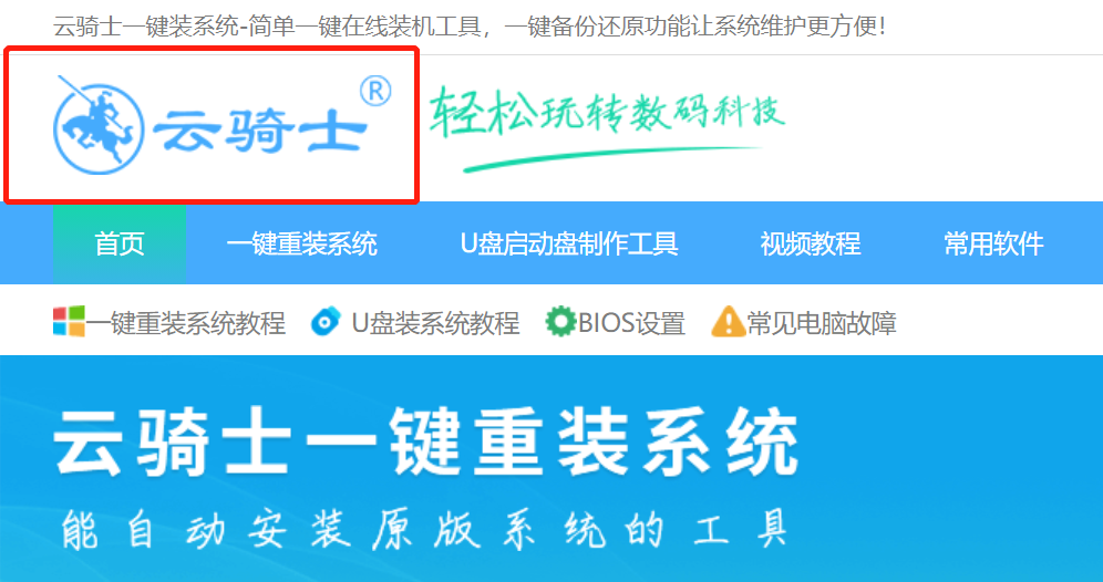 2、進入后可以看到帶有云騎士R標的網頁,這個就是云騎士一鍵重裝系統官網了。
