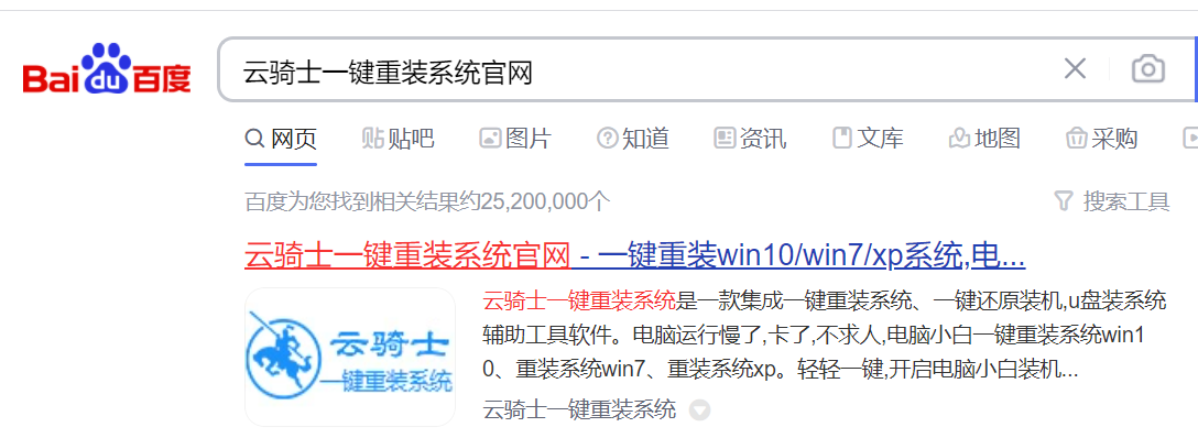 1、百度搜索云騎士一鍵重裝系統官網,選擇第一項進入。