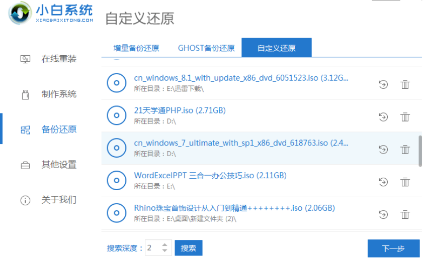 2、選擇“自定義還原”,選擇需要安裝的win10家庭版系統鏡像,點擊下一步。