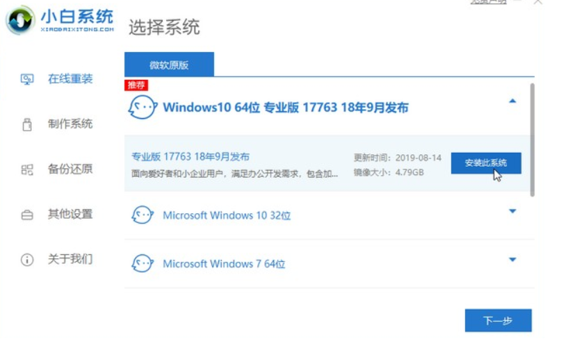 3、進入系統選擇界面,在這里選擇自己需要安裝的win10系統,點擊下一步。