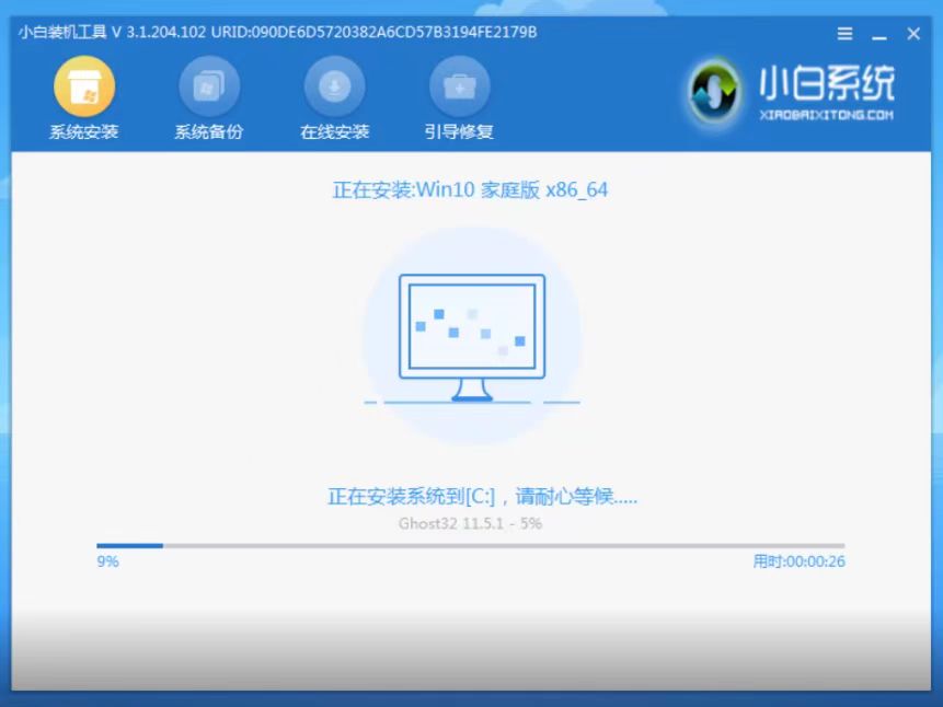 8、等待幾分鐘后進入PE系統界面,小白裝機工具會自動開始安裝系統,耐心等候重啟進系統。
