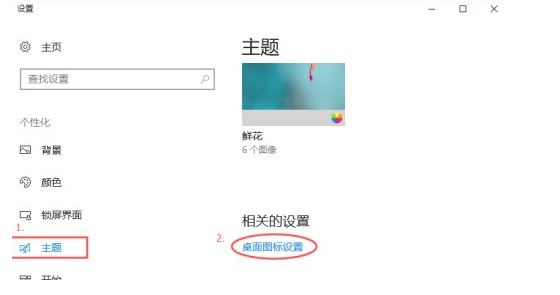 6.進入設置頁面左側,點擊“主題”,再在右側找到相關設置下的“桌面圖標設置”,點擊打開。