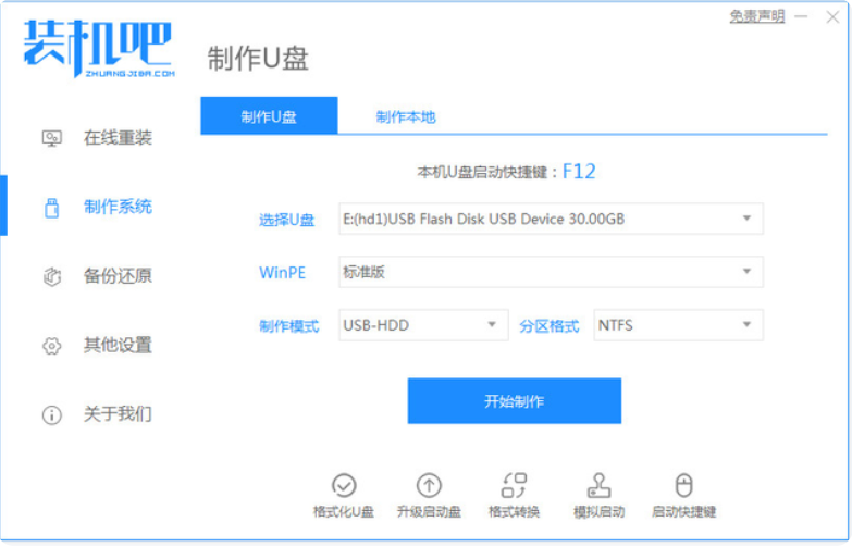 1、u盤怎么重裝系統win10,首先需要制作u盤啟動盤。按照圖中所示安裝好裝機吧一鍵重裝系統工具打開后,插入一個8g以上的空白u盤,選擇u盤重裝系統模式,點擊開始制作啟動盤。