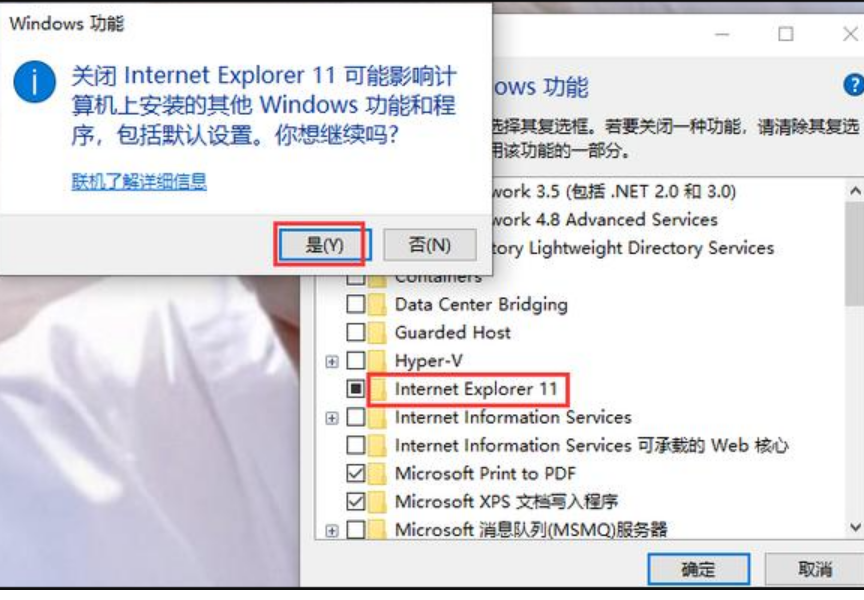 “Internet Explorer 11”并將其前面的勾勾去掉,彈出的確認窗口,點擊“是”即可。電腦重啟后選中Internet Explorer11前面的復選框,最后點擊確定。