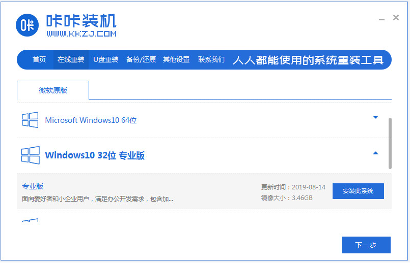 安裝咔咔裝機一鍵重裝系統工具,選擇需要的win10系統安裝;
