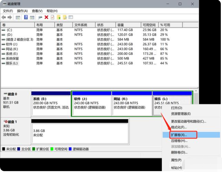 3、刪除卷(例如我們要合并上圖中的J盤和L盤),J盤右鍵選擇刪除卷。