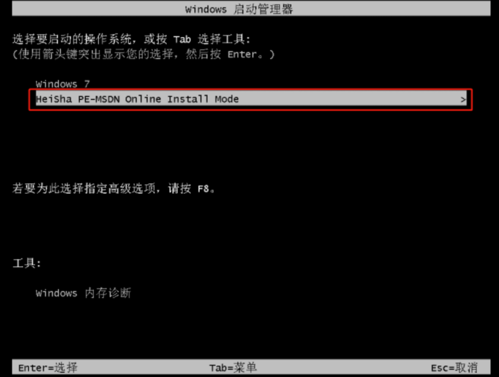 6、在window啟動管理器界面選擇HeiSha PE進入系統,然后等待安裝。