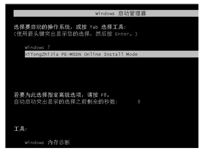6、重啟電腦后,選擇“xitongzhijia...”項 ,回車進入pe系統。