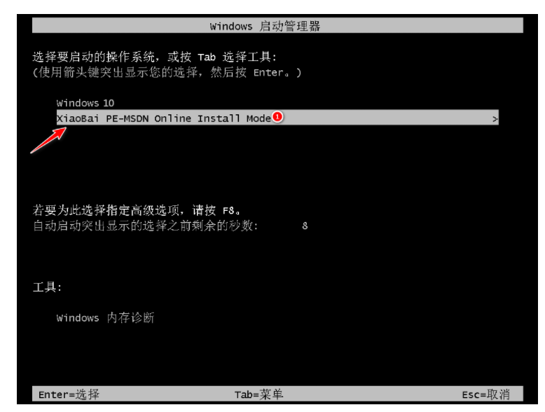 5、進入啟動管理器頁面,選擇xiaobai-pe選項,按回車。