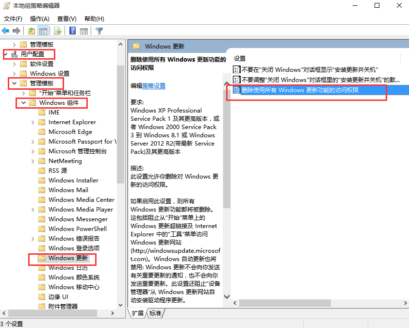 4、之后還需要在用戶配置-》管理模板-》windows組件-》windows更新中找到“刪除使用所有Windows更新功能的訪問權限”,選擇已啟用,完成設置后,點擊“應用”“確定”,如圖所示。