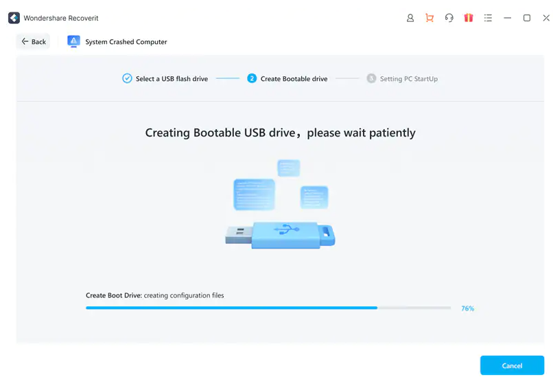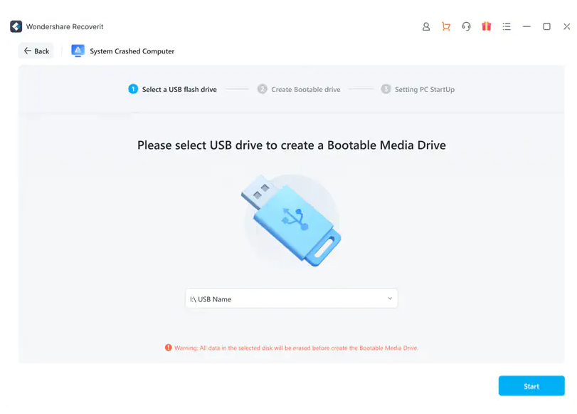 1、安裝萬興恢復專家后,啟動程序并從恢復選項“從崩潰計算機中恢復”模式,單擊下一個窗口上的“開始”按鈕。
