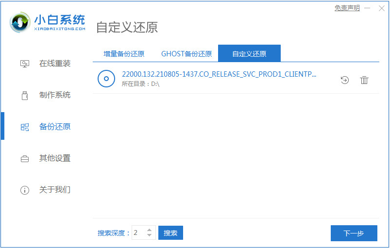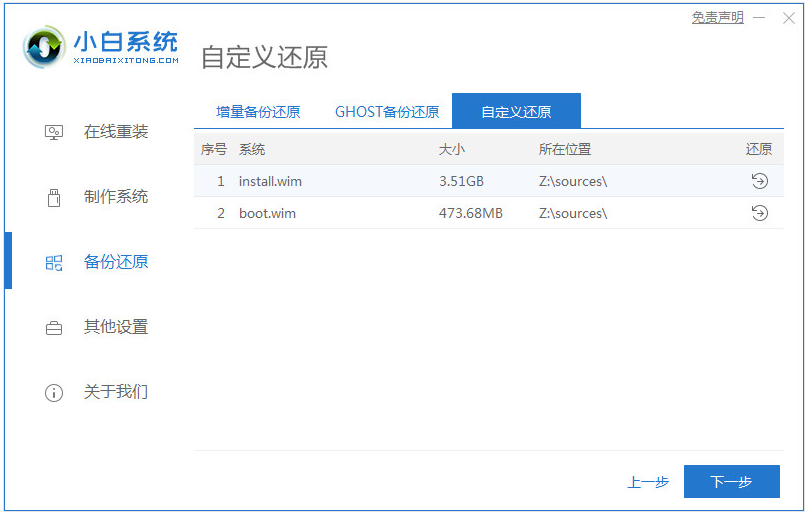 3、接著自行去搜索下載安裝小白一鍵重裝系統工具打開,點擊備份還原,再點擊自定義還原進入下一步。