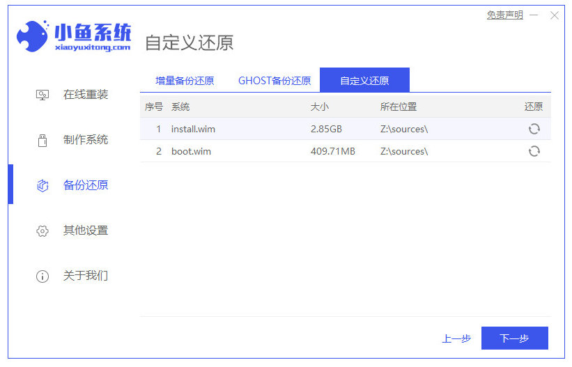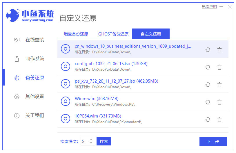 1.首先在官網上下載win10教育版鏡像文件,然后打開“小魚一鍵重裝系統”工具,點擊備份還原功能,找到剛下載好的鏡像文件,點擊下一步。