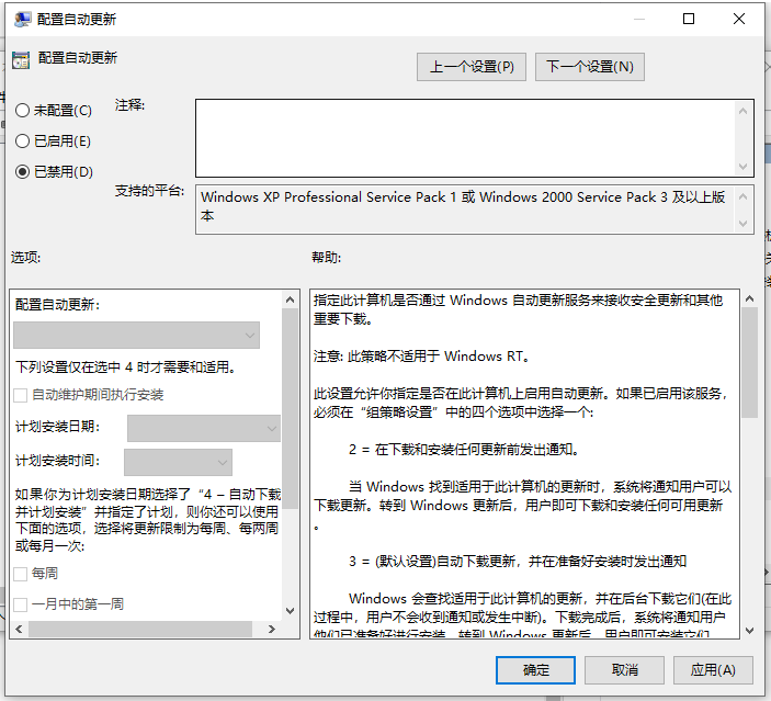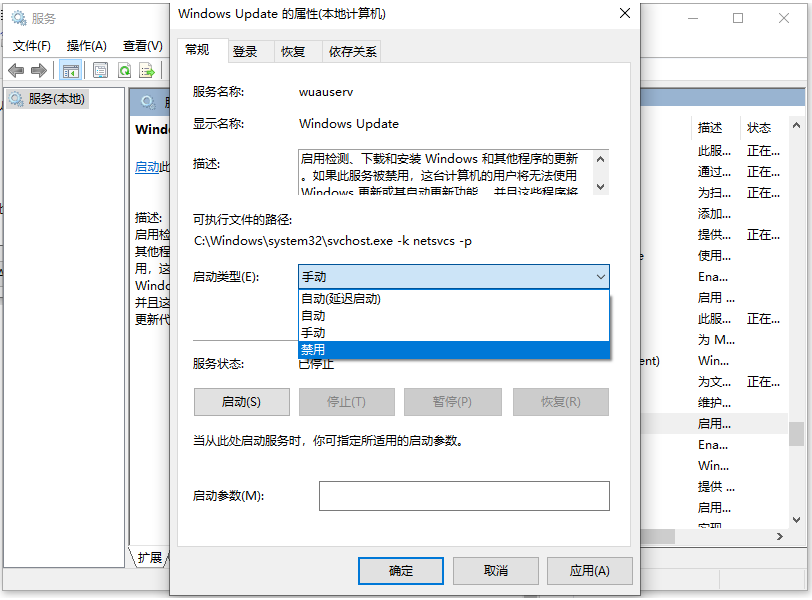 3、進入屬性界面,將其改為【已禁用】,之后點擊確定即可關閉win10自動更新。