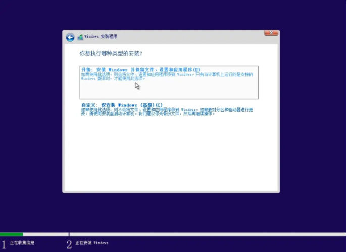 7、一般工具制作好后便會自動引導進入u盤啟動安裝系統。如果是升級自己的電腦則選擇第一個選項,新電腦裝系統則選擇第二個僅安裝windows。(如果沒有的話,可以自行打開引導菜單或打開電腦后立即按下按鍵(例如 F2、F12、Delete 或 ESC)等進入BIOS 或 UEFI 設置中更改引導順序。)