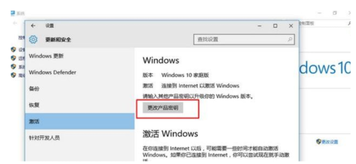 在系統設置中進入“更新和安全”界面,點擊“激活”項后再點擊“更新產品密鑰”項。