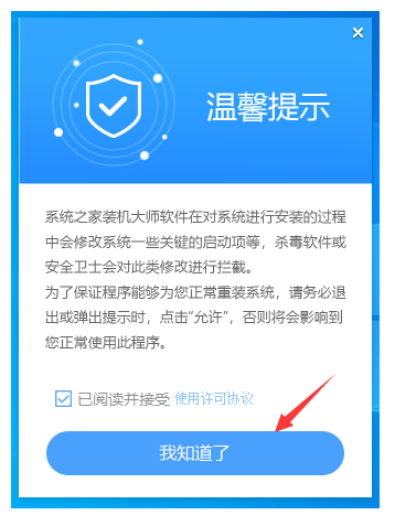 1、首先,關閉所有的殺毒軟件,然后雙擊運行系統之家裝機大師軟件,隨后點擊我知道了進入工具。
