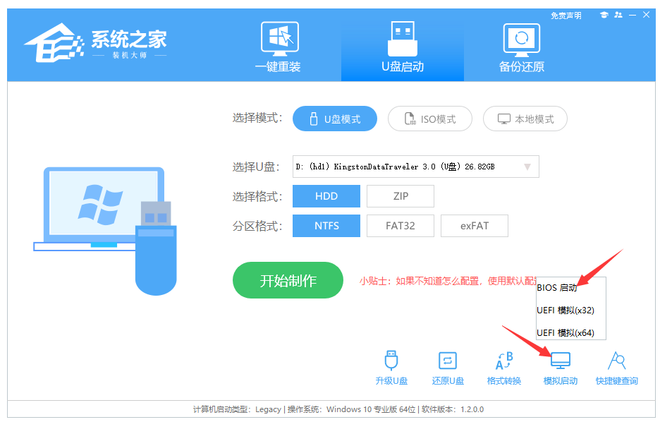 7、制作完畢后,需要測試當前U盤啟動盤是否制作完成。點擊右下方 模擬啟動-BIOS啟動,然后查看當前U盤啟動盤是否制作成功。