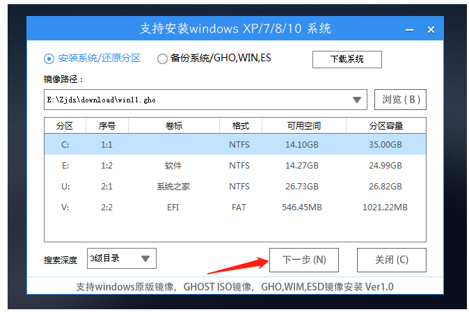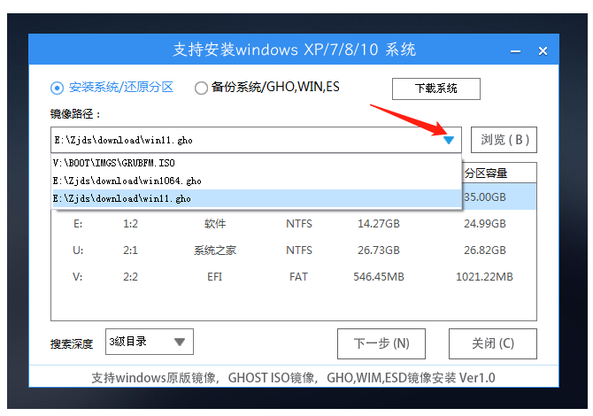 4、打開工具后,點擊瀏覽,選擇U盤中的下載好的系統鏡像ISO。然后再選擇系統安裝的分區,一般為C區。