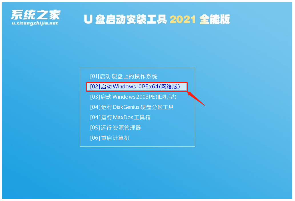 2、然后將U盤插入要重裝系統的電腦,重啟電腦按快捷鍵選擇U盤為第一啟動項。進入后,使用鍵盤方向鍵選擇第二個【02】啟動Windows10PEx64(網絡版),然后回車。