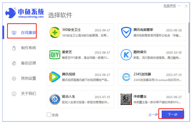 2、在“在線重裝的界面中”選擇想要安裝的軟件再點擊“下一步”。
