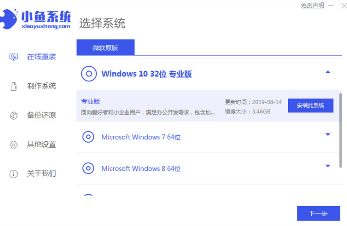 1.首先下載安裝小魚一鍵重裝系統工具,下載后打開后選擇win10專業版系統點擊“安裝此系統”;