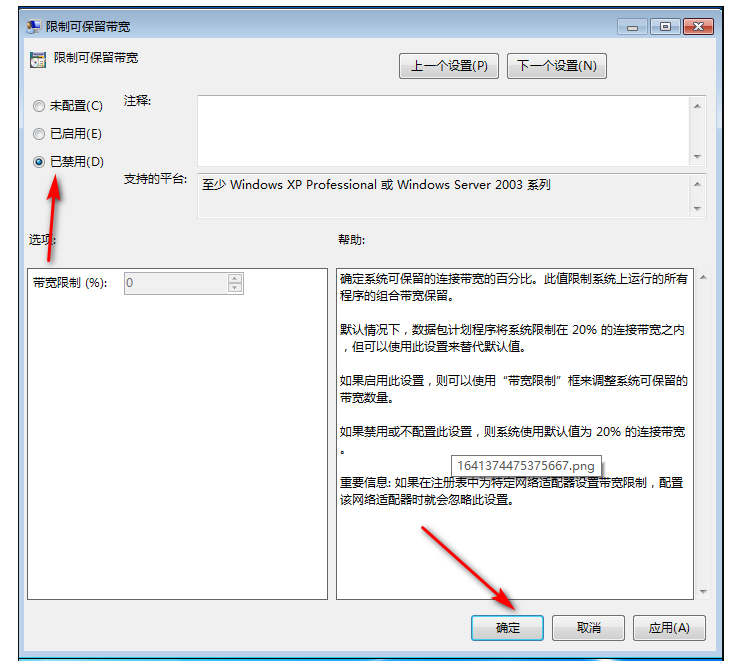 6、最后禁用“限制可保留寬帶”,點擊確定即可。