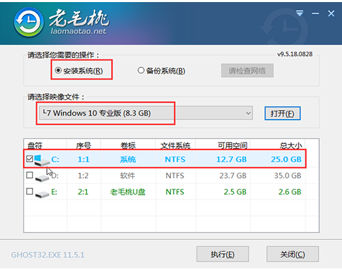 4、再打開老毛桃一鍵裝機軟件,選擇系統鏡像安裝到系統盤c盤,點擊執行即可。