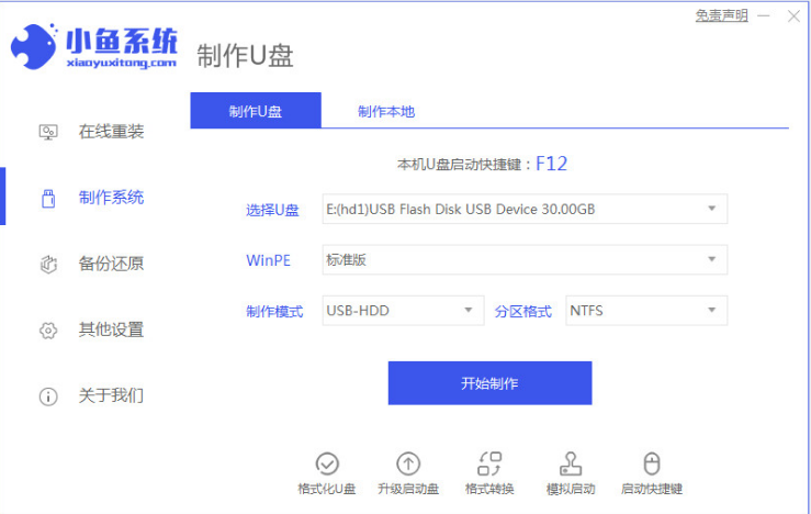 1、下載安裝小魚一鍵重裝系統工具打開,插入空白u盤,點擊開始制作。