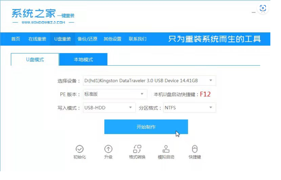 1、下載安裝系統之家一鍵重裝系統工具并打開,插入一個8g以上的空u盤,點擊開始制作。